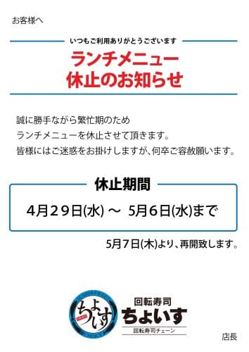 GW期間「ランチメニュー」休止のお知らせ